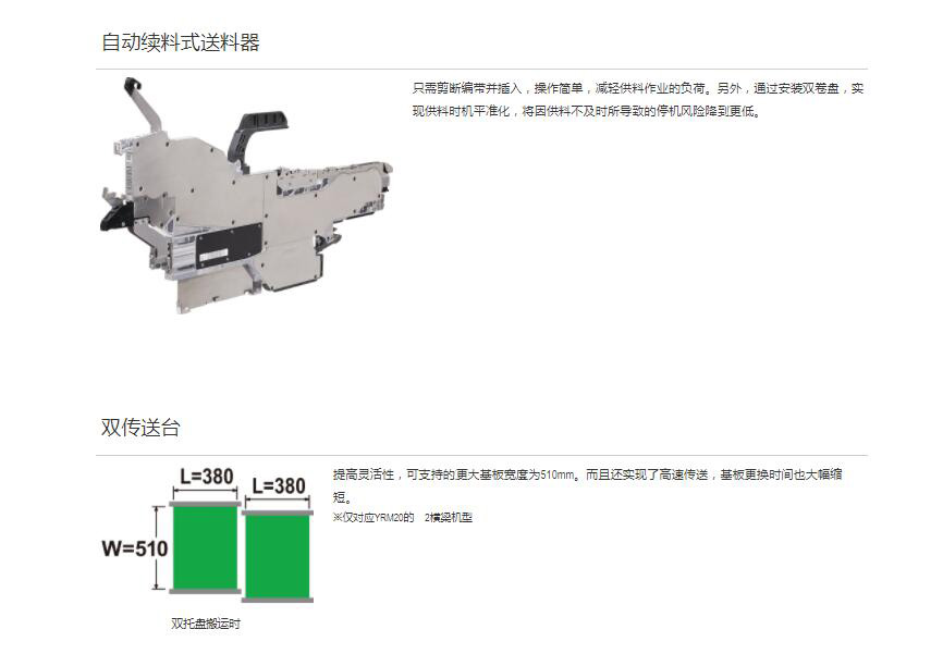 YRM20高效模塊貼片機 極 限改進“單一貼裝頭解決方案”,具有卓絕生產率和通用性的萬 能型貼片機1.融合Σ系列產品的技術,實現卓絕的生產率.2.采用“單一貼裝頭解決方案”,廣泛對應各種生產.3.標準配備可維持高品質貼裝的各項功能.4.通過運用豐富的功能群,實現高效生產.